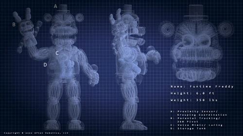Blueprints evidence wireframe of the chief four animatronics, likewise every bit different angles of rooms. The only mode to see these character blueprints is when rarely booting the game or entering a room.